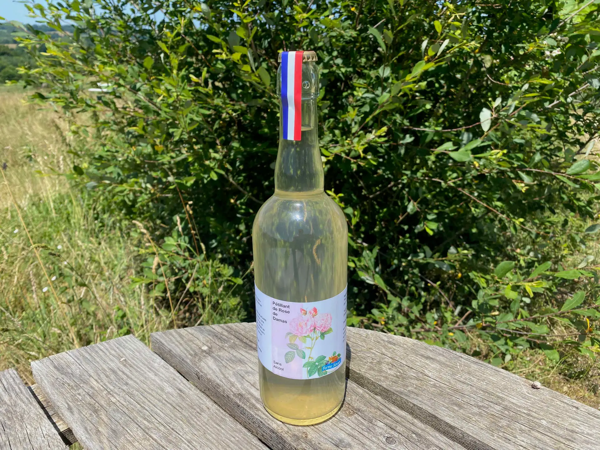 Boisson pétillante à la rose de Damas a une belle couleur rosé, sans alcool, son odeur de rose puis son goût délicat vous enchantera.